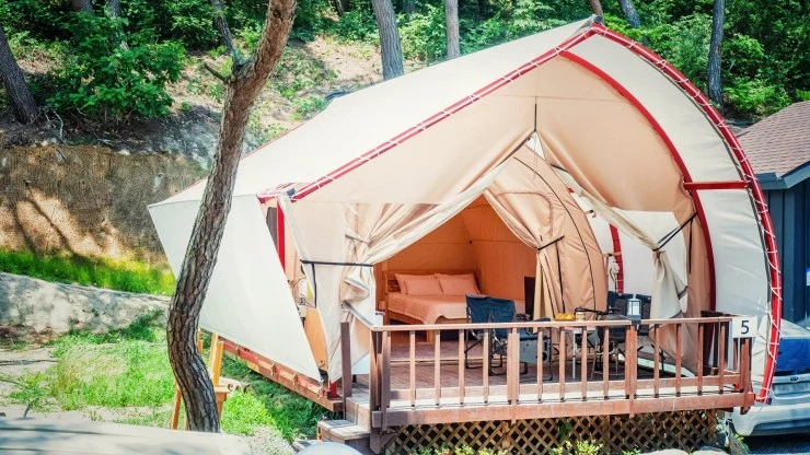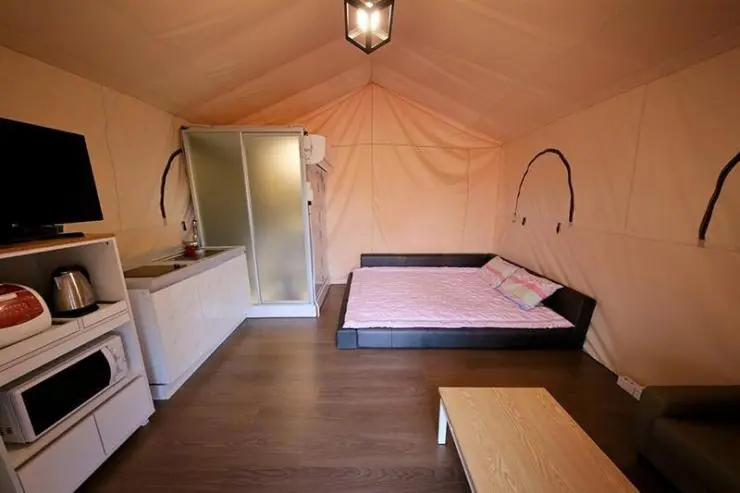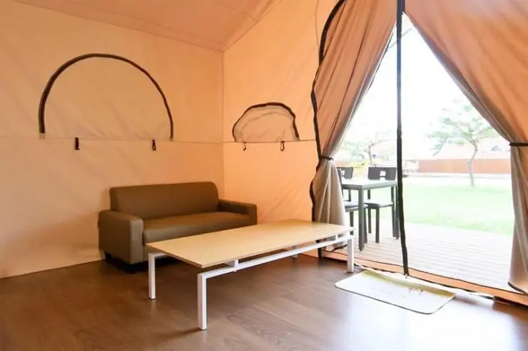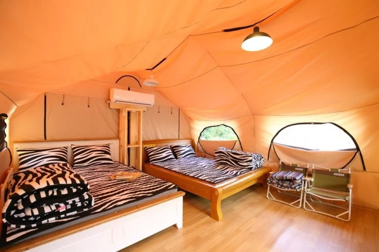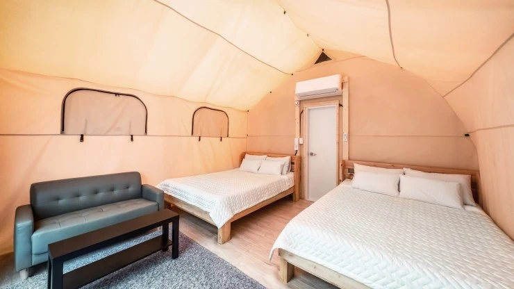 경주 별빛마루 글램핑 인기 객실인 럭셔리글램핑 내부에는 퀸사이즈 침대 2개가 구비되어 최대 4인까지 숙박 가능해 친구들과 함께 우정 여행하기에 제격인 곳이다. 전기매트도 준비되어 있어 겨울 글램핑에도 추위 걱정할 필요가 없다. 그뿐만 아니라 로우체어, 키친테이블, 에어컨, 냉장고 등 웬만한 용품은 모두 준비돼 있다.