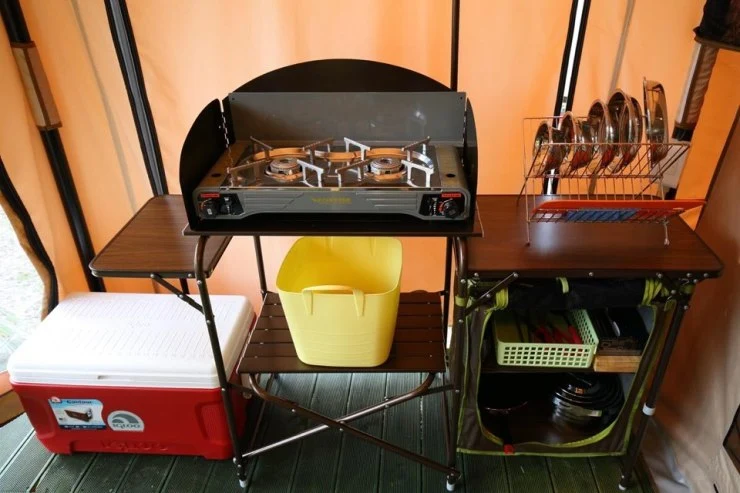 별빛마루 글램핑 객실 안에는 간이주방이 마련되어 있다. 2구 버너와 식기류 일체, 캠핑용 대형 아이스박스, 냄비, 후라이팬 등 준비되어 있다. 단 싱크대는 공용 개수대를 이용해야 한다.