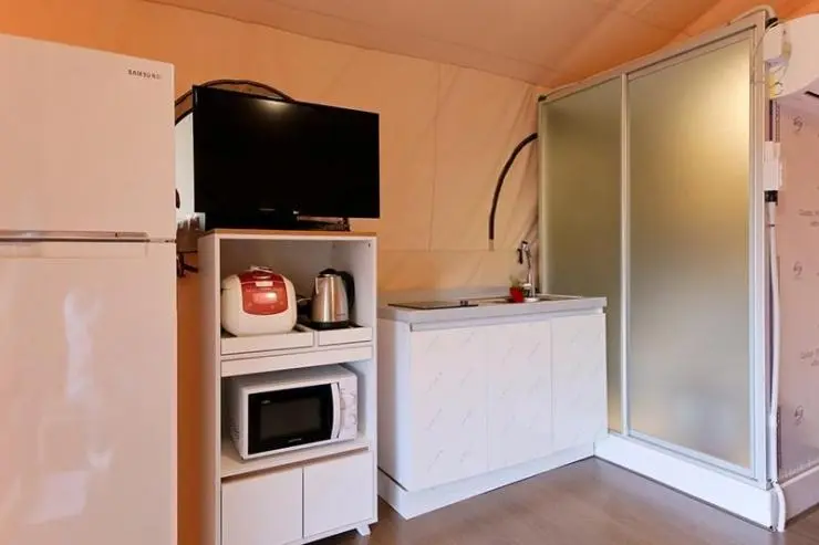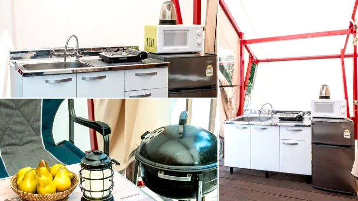 럭셔리글램핑 객실에는 개별싱크대와 버너, 전자레인지, 전기 포트, 냉장고, 식기류 일체가 준비되어 있다. 개별 데크에서 사랑하는 가족, 친구, 연인과 맛있는 음식 즐기며 특별한 추억 쌓을 수 있다.