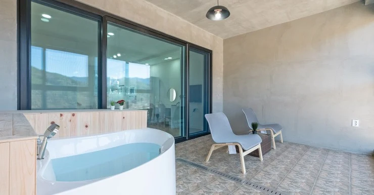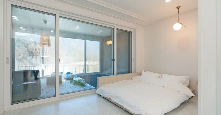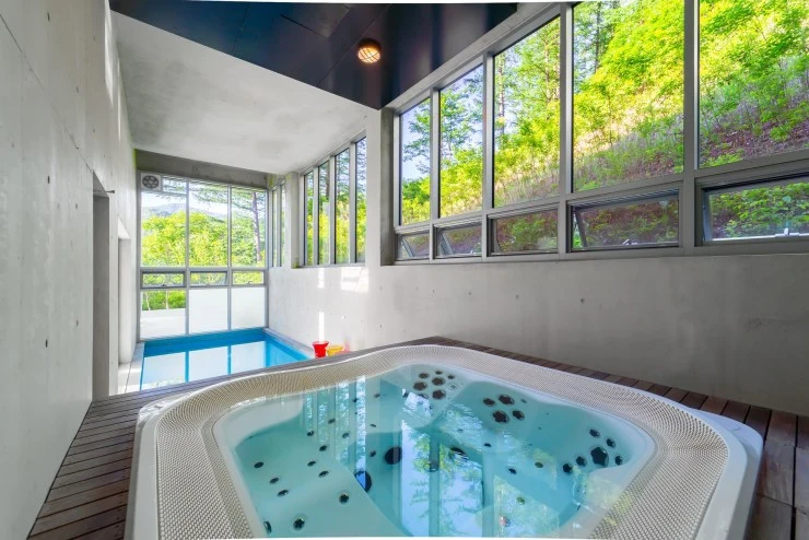 유리트리트 홍천 펜션 객실은 총 9개이다. 포레스트와 힐스, 벨리, 스트림으로 나뉜다. 물놀이를 좋아한다면 풀빌라 타입의 벨리 객실을 추천한다. 개별 미온수 수영장 온도는 30~32도로 유지해준다. 천연 암반수로 운영되며 화학 약품 대신 천연 소금을 사용해 안심할 수 있다. 맞은 편에는 최고급 스파도 갖췄다.