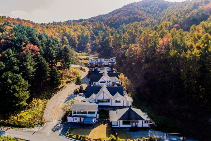 숲에 둘러싸인 홍천 펜션 르그랑샤리오는 동화 속 작은 마을을 떠올리게 한다. 지붕 모양이 각기 달라 보는 재미가 있다. 내부에는 목재와 인테리어 조명으로 따뜻하고 안락한 분위기를 연출했다.