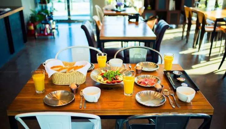 조식은 오전 8시부터 9시까지 운영된다. 전날 숙취를 한 번에 풀어 줄 수 있는 맛있는 북엇국과 8가지로 구성된 깔끔한 가정식 밑반찬이 제공된다. 밥은 기본으로 제공되며, 계절 과일도 함께 준비해준다.