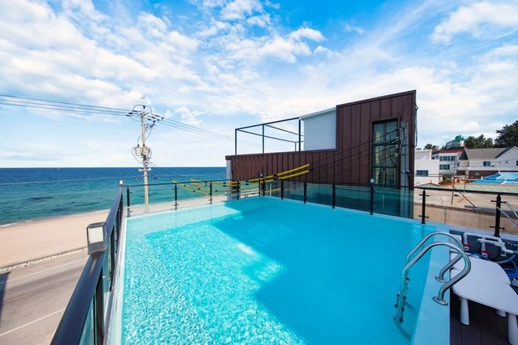 더 퍼스트펜션에는 4월부터 10월 말까지 미온수 수영장이 운영된다. 강릉 오션뷰 감상하며 수영을 즐길 수 있다. 하지만 동절기에는 운영되지 않으니 겨울철에는 객실 내 스파를 이용하자.