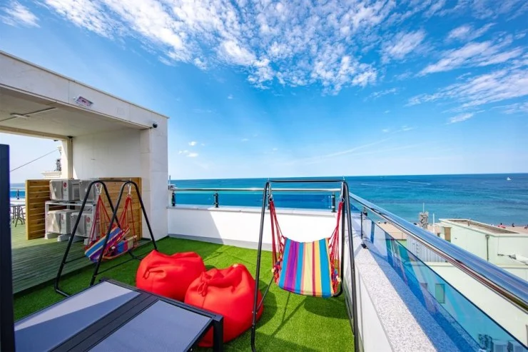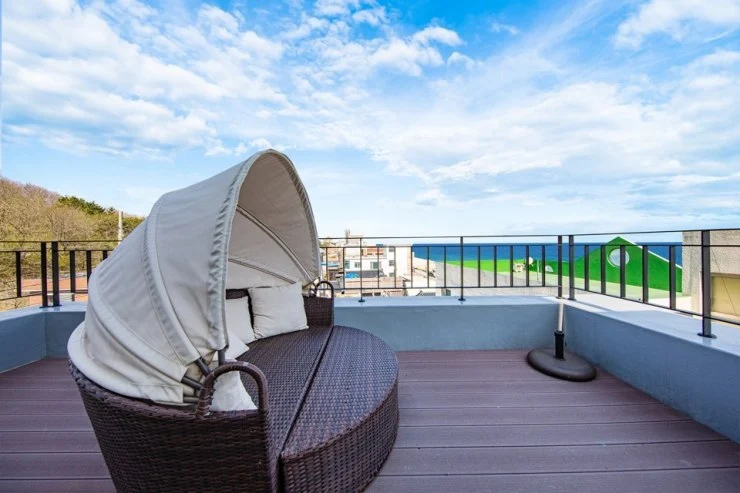 위펜션에서 오션뷰를 즐길 수 있는 또 하나의 방법! 바로 옥상에 마련된 루프탑이다. 루프탑에는 해먹과 빈벡소파, 썬베드 등이 마련되어 더 편안하게 바다 전망을 감상할 수 있다.