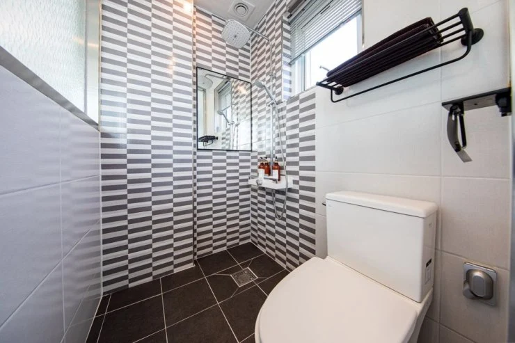 모던하게 꾸며진 욕실에는 샤워부스가 준비되어 있다. 샴푸, 린스, 바디워시를 비롯한 치약, 칫솔, 수건, 헤어드라이어 등 대부분 어메니티가 준비어 있다. 클렌징폼과 면도기 정도만 준비하면 된다.