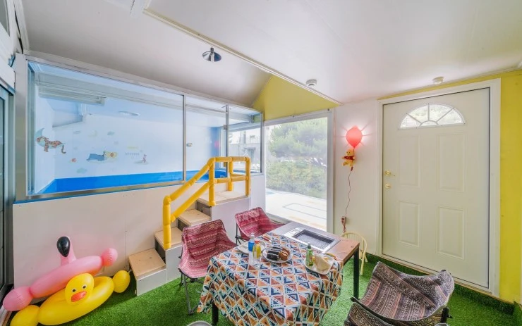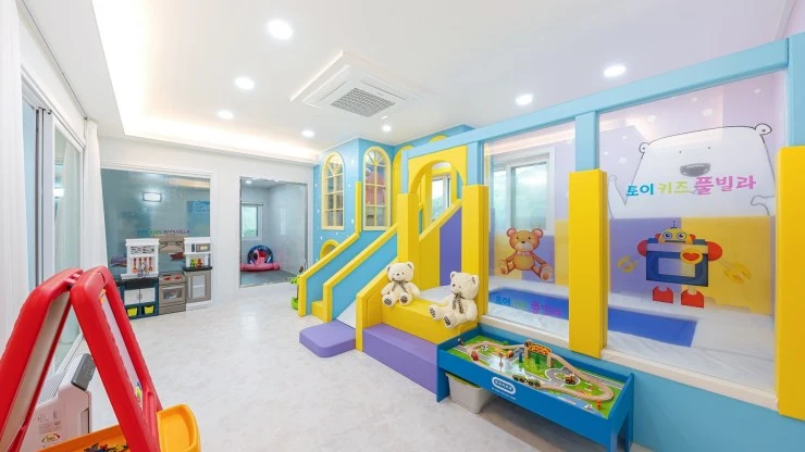 토이는 럭셔리 키즈 펜션으로 손꼽히는 숙소이다. 모든 객실에 개별 온수 키즈 풀을 갖췄다. 구명조끼와 어린이 튜브도 구비해 놨다. 이와 더불어 펜션에서는 유아와 어린이 용품 대여 서비스를 제공 중이다. 바운서와 보행기, 어린이 식기류, 젖병 소독기 등을 완비했다.
