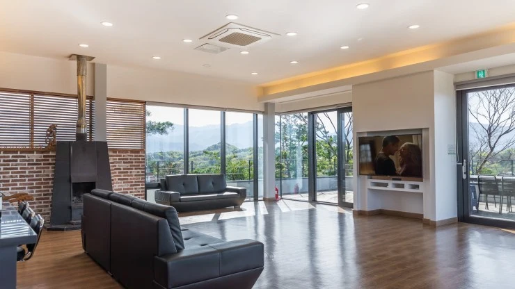 모닝뷰펜션은 넓고 쾌적함을 자랑한다. 그중 로얄 객실은 복층형 구조로 되어 있어서, 뛰어 다녀도 될 넓은 거실과 침대룸 2개, 바비큐하기 좋은 개별 테라스로 구성되어 있다.