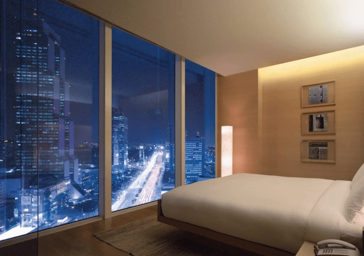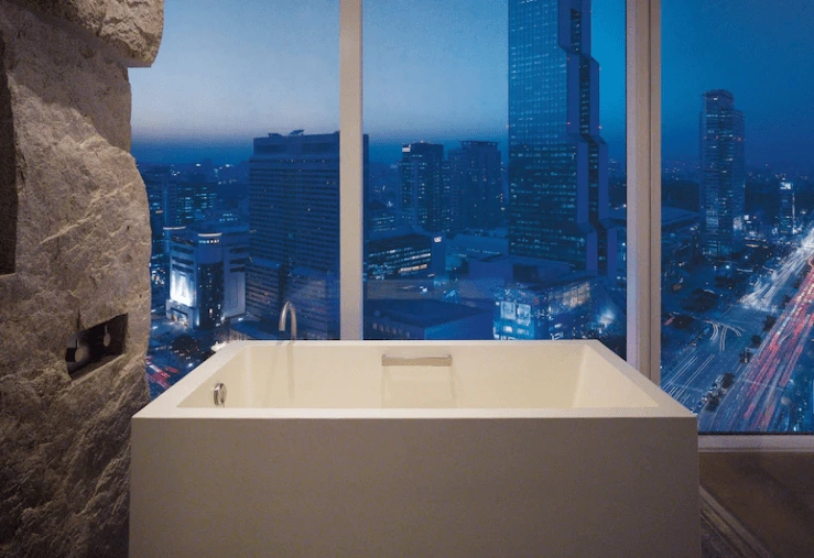 파크하얏트 객실은 정교한 예술적 요소가 더해져 고급스럽다! 바닥부터 천장까지 어이진 통유리창으로는 강남이 한가득 들어온다. 호캉스 목적이라면 파크 스위트 객실을 추천한다. 넓은 스파 욕조가 인상적이다. 일 년간 어깨를 짓눌렀던 피로를 따끈한 스파로 한 번에 녹여보자.