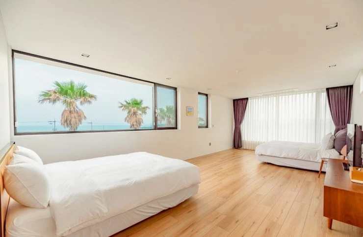 따뜻한 분위기의 쿠니네 침실은 오션뷰를 감상할 수 있어서 그저 보고만 있어도 힐링이 되는 객실이다.