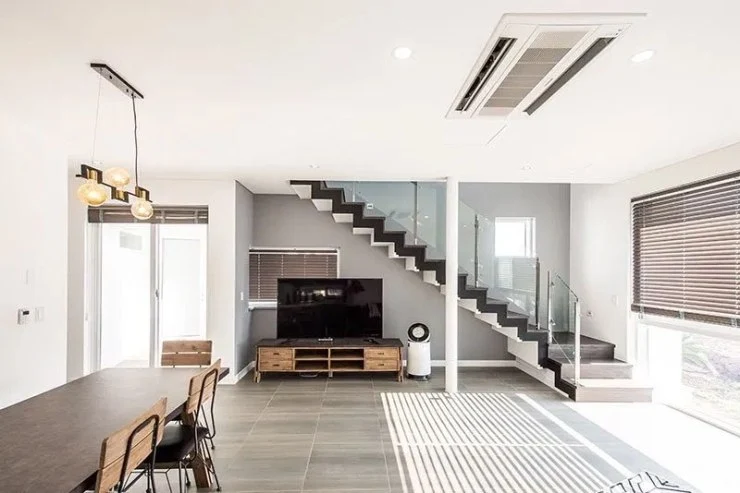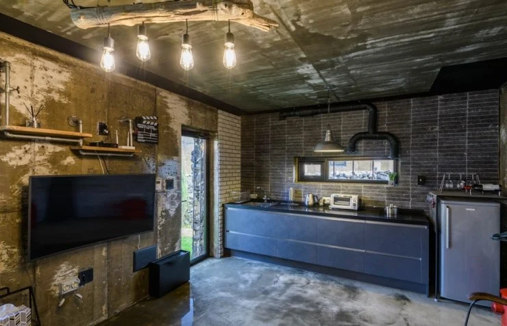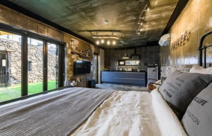제주 전통가옥을 트렌디한 인더스트리얼 감성으로 재해석한 독채 객실로 커플 여행 숙소로 특히 인기가 높은 곳이다. 제주 감성숙소 벙커는 안채와 바깥채 총 2동으로 이루어져 있다. 사진 속 객실은 바깥채로 퀸사이즈 침대 1개, 개별 주방과 욕실이 딸려있다.