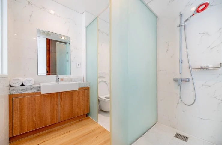 욕실 어메니티로는 샴푸, 바디워시 그리고 칫솔, 치약, 비누, 면도기, 빗은 호텔식 일회용 제품이 준비되니 몸만 가볍게 와도 된다.
