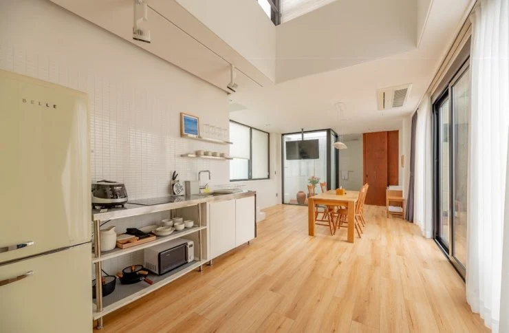 바깥채의 주방에는 미니오븐, 커피포트, 인덕션, 냉장고, 냄비, 식기류 등 준비되어 있다. 간단한 요리와 식사는 객실 안에서 해결할 수 있다.