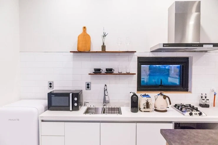 냉장고에는 식빵, 버터, 딸기잼, 우유, 물 등이 무료로 비치되어 있다. 커피포트, 토스터, 커피머신 모두 인스타 감성으로 깔끔하게 꾸며져 직접 챙겨 먹으면 더 맛있는 아침을 맞이할 수 있다.