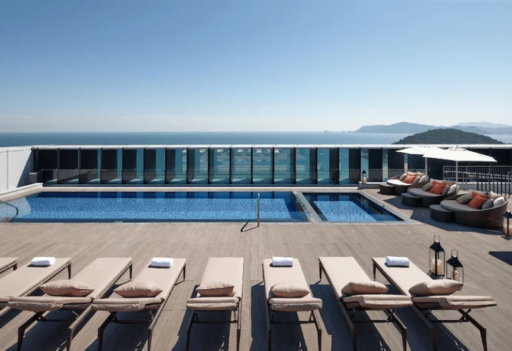 해운대 중심에 자리했다. 군더더기 없이 깔끔한 외관을 자랑한다. 해수욕장까지 도보 5분 거리로 가깝다. 그만큼 전망도 끝내준다. 이를 최대화 하기 위해, 객실에는 커다란 통창을 설치해 놨다.