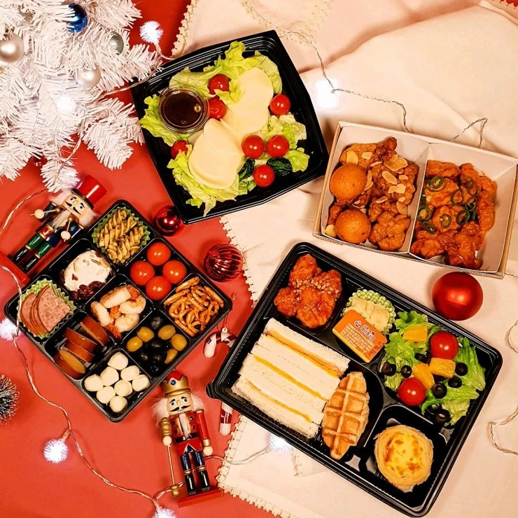 세븐일레븐은 연말 파티 4종 세트를 출시했다. 치즈 플래터, 반반 닭강정 등 인기 있는 메뉴들로만 구성되어 있다. 가격도 만 원을 넘지 않아 합리적이다! 루시카토, 매일유업 등과의 콜라보 한 케이크도 준비되어 있다.