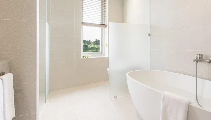 욕실에서도 푸른 숲 뷰를 조망할 수 있다. 어메니티로는 록시땅의 샴푸, 헤어 컨디셔너, 바디워시, 바디로션 등이 준비된다.