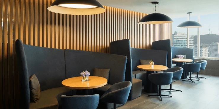 라운지는 06:30 ~ 23:30 동안 운영돼요. 워크스테이션이 잘 갖춰져 있고 회의실도 2시간 무료 사용 가능하다. 현재 사회적 거리두기에 따라 조식은 단품으로 제공된다. 06:30 ~ 10:00에 테이크 아웃도 가능하다. 해피아워는 2부제로 운영하고 있다. 비즈니스호텔이지만 해피아워 메뉴가 잘 갖춰진 편이라 만족도가 높다. 1부 17:00 ~ 19:00 / 2부 19:00 ~ 21:00에 이용할 수 있다.