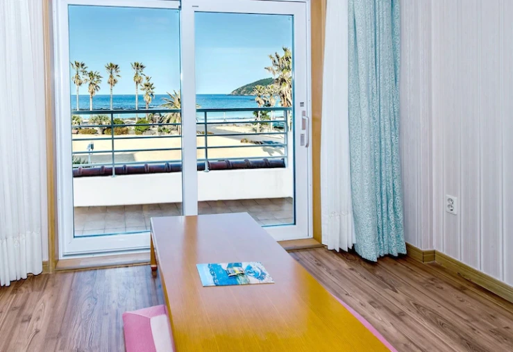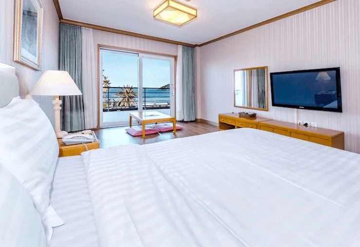 아이와 함께 또는 부모님을 모시고 온 여행자에게 추천하는 가성비 제주 함덕 숙소 객실이다. 침대도 구비해놨다. 이외 TV와 좌식 책상, 냉장고, 전기 포트를 갖췄다. 무엇보다 창문 밖 오션뷰가 환상적이다.
