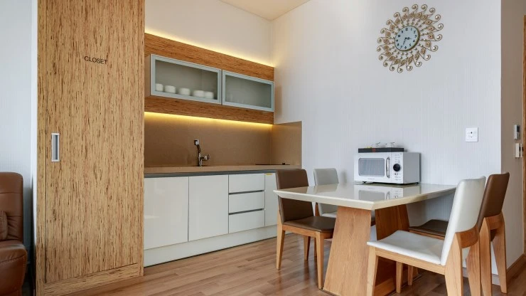 룸콕 펜캉스를 완성하려면 주방은 필수이다. 거실 한 편에는 꽤 제대로 된 부엌이 갖춰져 있다. 싱크대와 식탁, 인덕션, 전자레인지 등을 완비했다. 식기류도 기준 인원에 맞게 부족함 없이 갖췄다.
