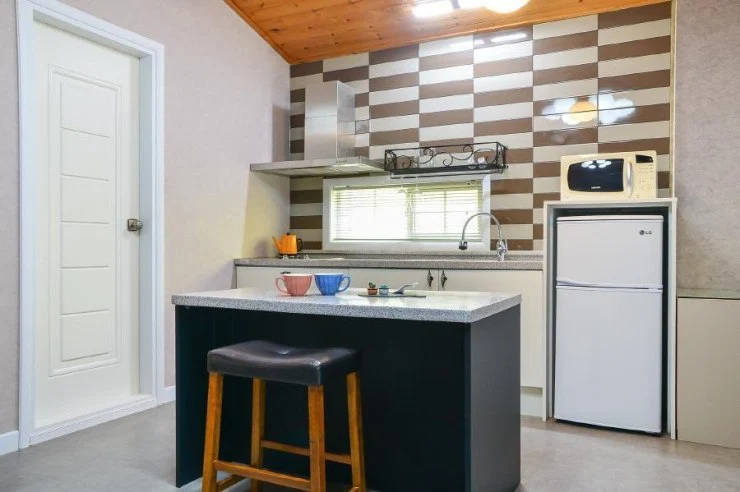 브라운트리 객실은 긴 일자형 주방이 준비되어 있다. 공간이 넓은 만큼 인덕션, 커피포트, 전자레인지, 밥솥, 냄비, 식기류, 컵, 와인잔 등 일체가 구비되어 있다. 커플룸이니 모두 두 세트씩 준비돼 있다.