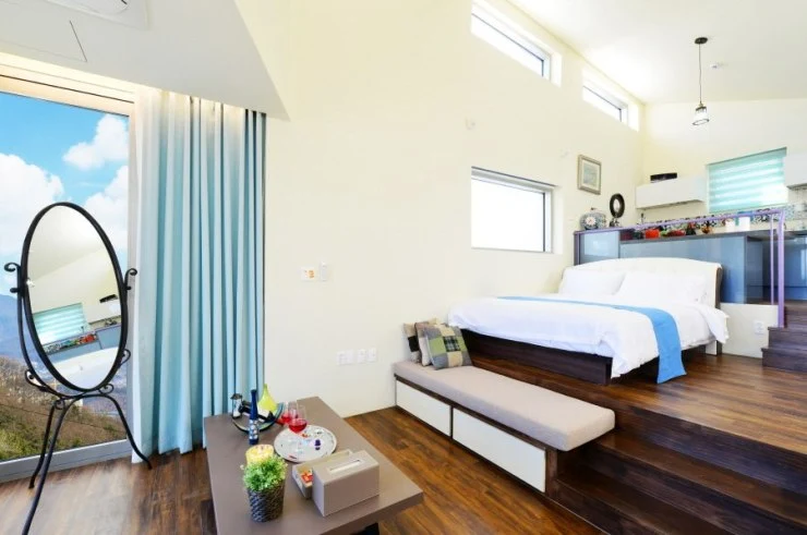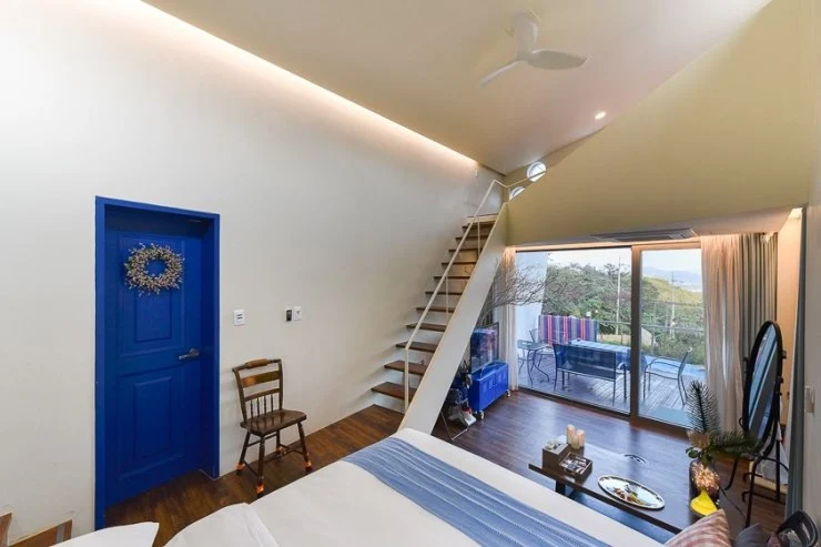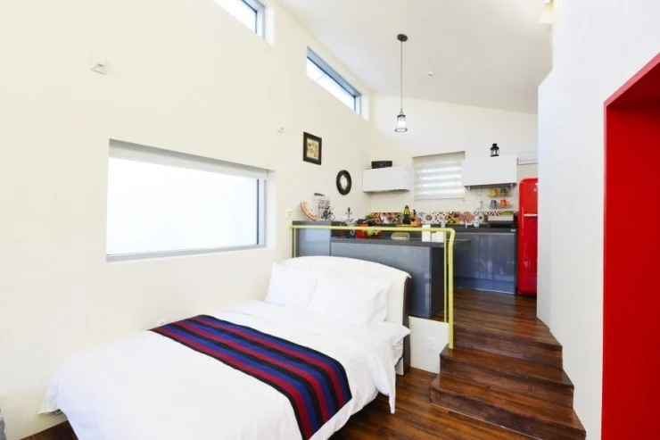 복층 구조로 1층에는 TV, 소파, 킹사이즈 침대, 주방이 준비되어 있다. 인원이 초과할 경우 성인 4만 원, 아동 3만 원 추가해 주시면 복층 다락에 푹신한 퀸사이즈 침구를 추가로 마련해 주니 4인 가족 또는 친구와 함께하는 여행도 충분하다.