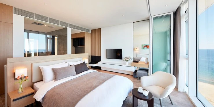 천장부터 바닥까지 이어진 통창으로는 송지호 해변이 한가득 들어온다. 르네블루 바이 워커힐은 전 객실 오션뷰를 자랑한다. 기본 룸인 디럭스 룸에서도 푸른 바다를 볼 수 있다.