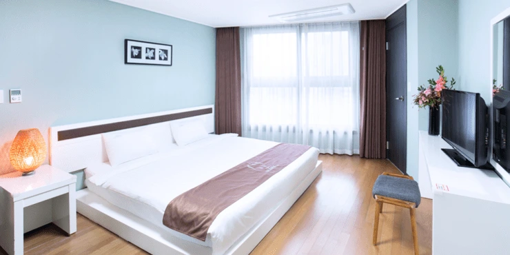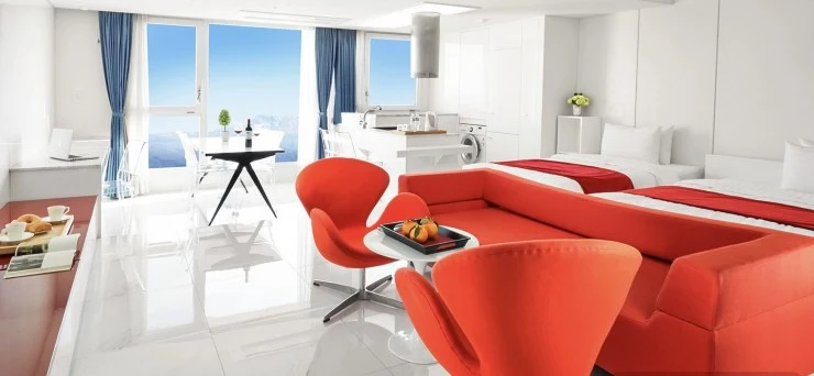 객실은 스탠다드, 디럭스, 프리미어로 총 3가지 타입을 보유하고 있다. 전 객실 빌트인 냉장고 및 주방도구가 완비되어 있는 완벽한 취사가능 레지던스 타입이다! 객실 내에 세탁기도 있어서, 한 달 살기 숙소로 인기가 높을 수밖에 없다.