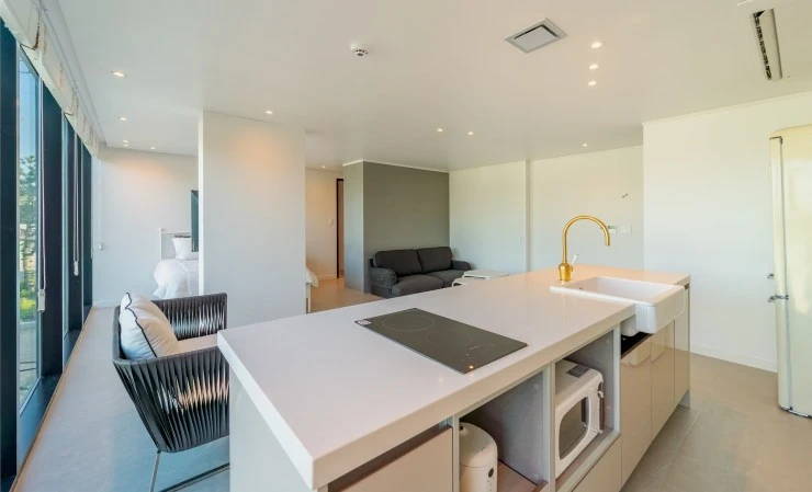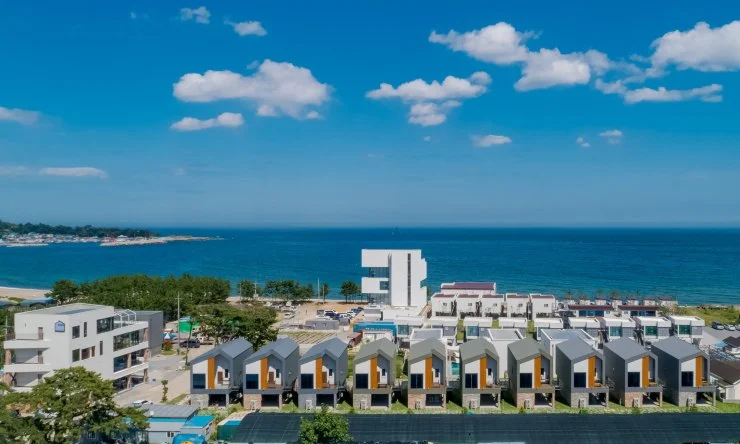 드넓은 바다를 마주한 숙소는 외관과 내부 모두 세련되게 꾸며졌다. 화이트톤 건물 덕분에 외국 휴양지에 온 듯한 기분이 든다. 인테리어 가구와 소품으로 채워진 객실에는 전면 창을 설치해 일출 보기에도 좋다.