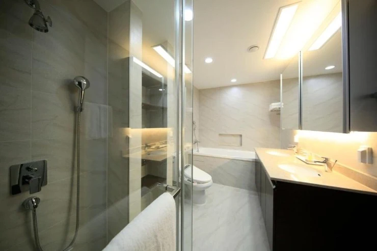 욕실에는 욕조와 샤워부스가 각각 설치돼 있다. 어메티로는 샴푸, 바디워시, 바디로션, 비누, 수건, 목욕가운, 슬리퍼, 헤어드라이어가 준비된다. 그밖에 칫솔, 치약, 클렌징폼, 면도기 등 일회용품은 제공되지 않으니 개별적으로 준비해오자.