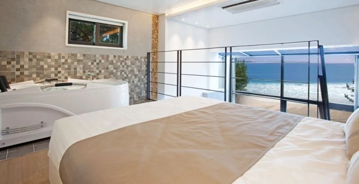 고성 펜션 ‘라헨느풀빌라J동’은 바다 전망과 소나무가 어우러진 아름다운 전망을 자랑한다. 객실은 스파 또는 풀빌라로 나뉘는데 그중에서도 복층으로 구성돼 아름다운 경치를 감상하며 따뜻한 스파를 즐길 수 있는 ‘스파빌라’ 객실은 단연 인기가 높다.