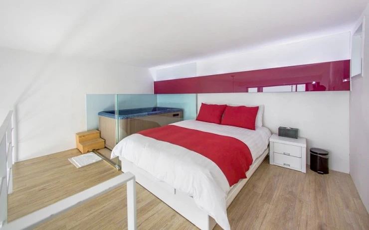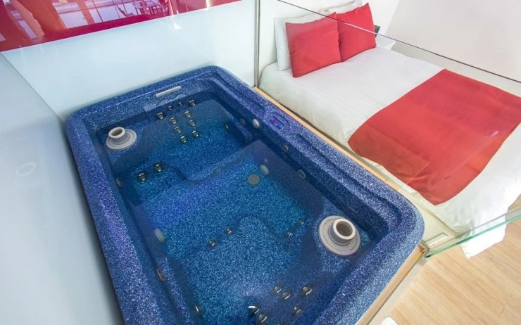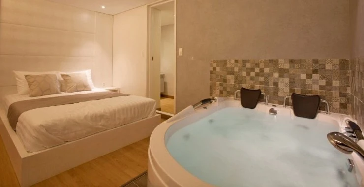 하버빌 펜션은 모든 객실에 제트스파가 마련되어 있다! 디럭스 룸은 침대 옆에 스파 욕조가 있어 한겨울에도 따뜻하게 입욕을 즐길 수 있다는 장점이 있다! 욕조 옆 가림막이 있어 물이 튈 걱정도 없다.