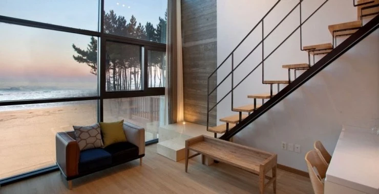 바다 전망 테라스와 제트스파 시설을 갖춘 고성 펜션 하버빌은 아름다운 일출을 감상할 수 있는 해돋이 명소로도 유명한 곳이다! 디럭스 객실은 복층형으로 구성돼 1층에는 거실 겸 주방이, 2층에는 침실과 실내 스파가 설치되어 있다.
