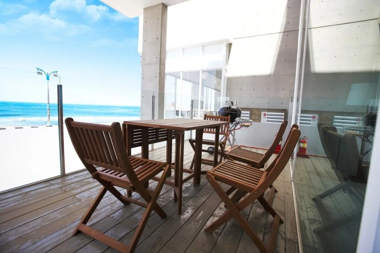 고성 펜션 보노보노의 201호는 2층에 있지만, 테라스가 넓어 뛰어난 바다 전망을 자랑한다. 테라스에서 바비큐와 바다 전망 스파를 무료로 즐길 수 있어 인기가 높은 객실이다.