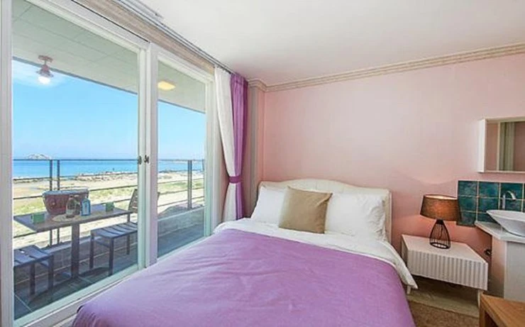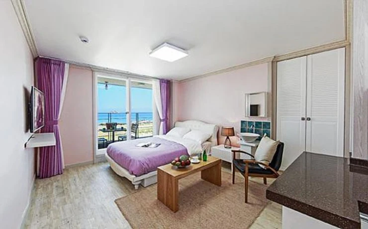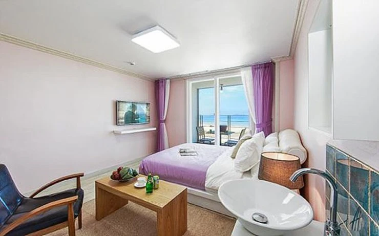 원룸형 구조로 오션뷰를 감상할 수 있는 침실과 주방, 그리고 세면대와 욕실이 분리된 구조라 일행과 함께 효율적으로 이용할 수 있다.