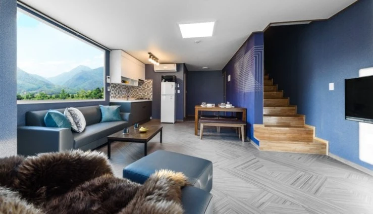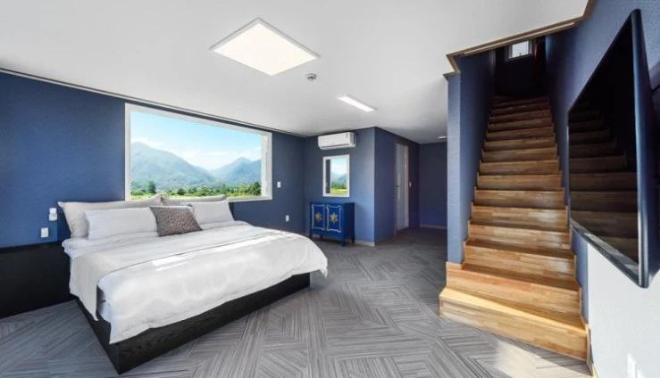1층에는 거실과 침실이, 복층에는 아늑한 다락방이 준비되어 있다. 주방이 있어 객실 내 간단한 취사도 가능하다. 별도의 바비큐 시설은 제공되지 않으니 참고하자. 어메니티도 꼼꼼히 갖춰져 있어 칫솔만 들고 가면 된다. 객실에 따라 2인 ~ 6인까지 투숙이 가능하다. 커플, 가족 여행에 적합한 강릉 독채펜션이다.