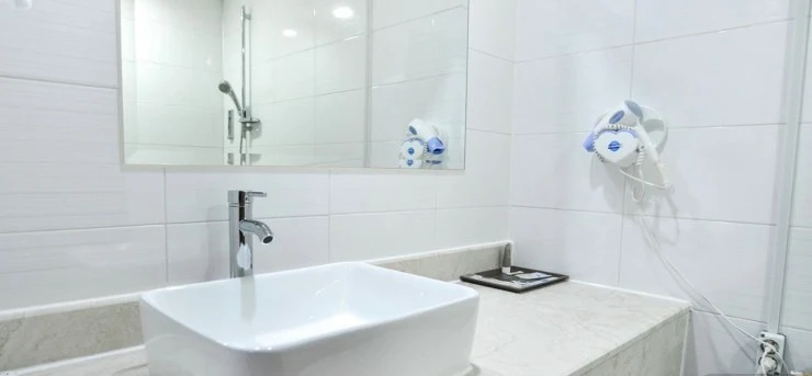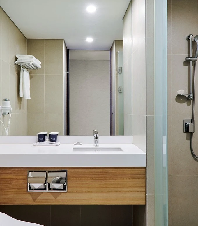 디럭스 더블룸 객실에는 욕조가 구비되어 있어 여행의 피로를 입욕으로 풀 수 있어 딱 좋다! 욕실에는 샴푸, 헤어 컨디셔너, 바디워시, 비누 등 세안 용품과 수건 등이 준비되어 있고 그 밖에 칫솔, 치약, 면도기, 바디 스펀지 등 일회용품은 화장대 위에 준비되어 있다.
