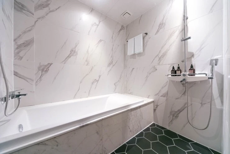욕실에는 샤워부스 또는 욕조가 설치되어 있다. 욕조를 원하시는 분은 체크인하실 때 미리 확인하시는 걸 추천한다! 어메니티로는 샴푸, 헤어 컨디셔너, 바디워시, 바디로션, 비누, 칫솔, 면봉, 샤워캡, 화장솜, 수건, 헤어드라이어 등이 준비돼 있다.