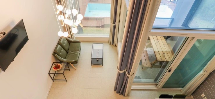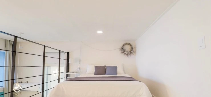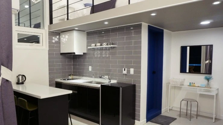 B동 201은 복층으로 이루어져 1층은 거실 겸 주방, 욕실로 구성돼 있으며, 2층은 침대가 놓여 잠을 깊이 잘 수 있는 구조로 이루어져 있다.