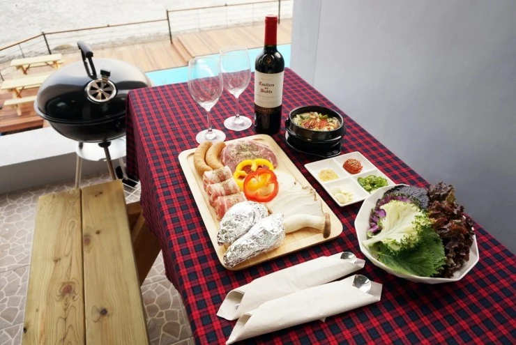 모든 객실에는 개별 테라스가 있기에 연인과 함께 프라이빗한 바비큐를 즐길 수 있다! 숯과 그릴은 2인 기준 1만 5천 원만 현장 결제하면 된다. 하계시즌 운영되는 야외 수영장도 준비되어 있다! 여름철에는 일몰 감상하며 물놀이까지 즐길 수 있으니 재방문 각!