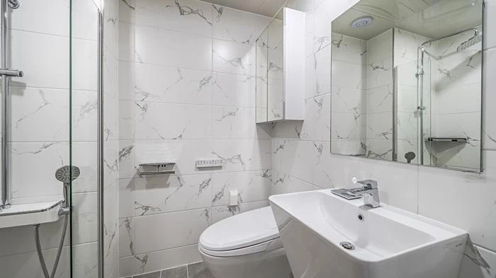 화이트 톤의 깔끔한 욕실에는 샤워부스가 설치되어 있고, 샴푸, 헤어 컨디셔너, 바디워시, 치약, 칫솔, 바디 스펀지, 비누, 수건, 헤어드라이어 등이 어메니티로 준비된다.