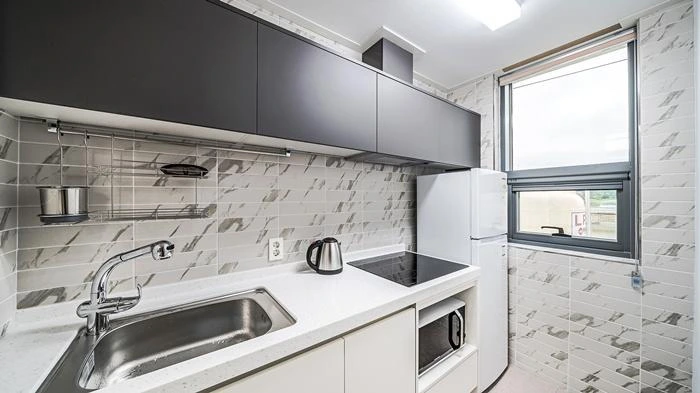 큼직한 주방에는 냉장고, 인덕션, 전자레인지, 싱크대, 식탁, 전기 포트 그 외 취사도구와 식기류 일체를 갖추고 있어 간단한 요리는 충분히 가능하다.