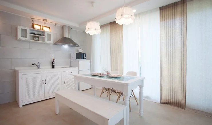 객실에는 아일랜드 식탁을 비롯한 전기밥솥, 전자레인지, 와인잔, 조리기구 일체, 전기 포트 등 웬만한 건 준비되어 있으니 커플 여행에서 직접 요리해 먹으며 즐거운 추억 만들 수 있다.