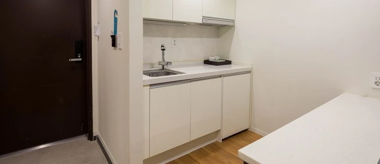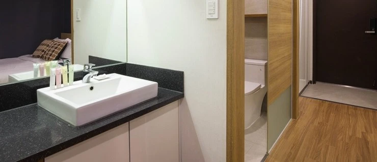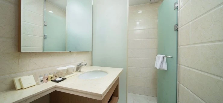 욕실은 샤워부스가 설치된 형태이다. 샴푸, 컨디셔너, 바디워시, 비누 등 어메니티는 제공되지만, 치약과 칫솔은 준비되지 않으니 개별적으로 챙겨 오거나 인근 편의점에서 구매하면 된다.
