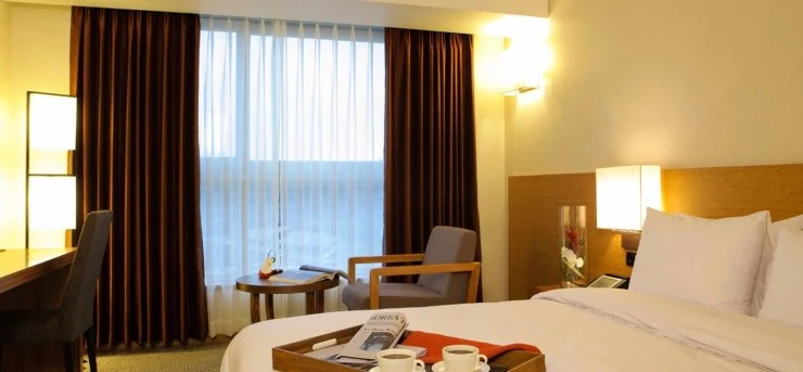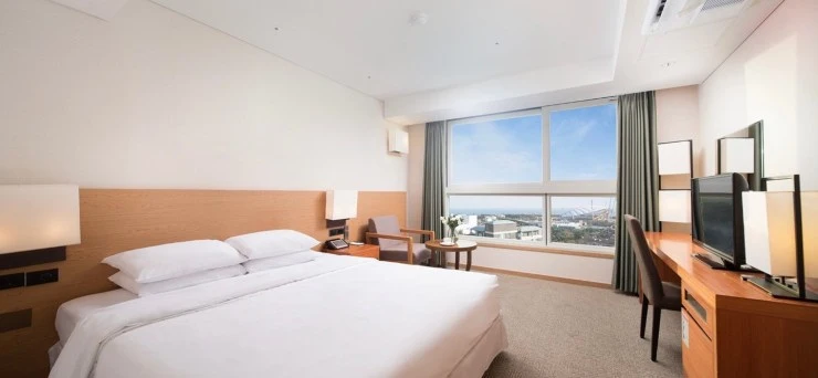 시내 중심에 위치한 서귀포 호텔 빠레브의 디럭스 더블 오션뷰는 모던한 객실 인테리어와 큰 창문을 통해 바다 전망까지 감상할 수 있어 더욱 인기 있는 곳이다! 퀸사이즈 널찍한 침대와 티 테이블, 화장대, TV, 의자 등이 구비되어 있다.