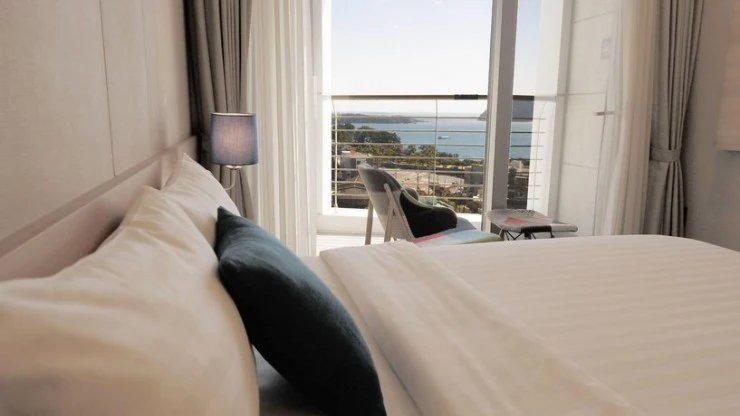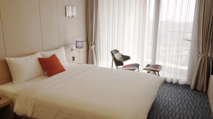 깔끔하고 편안한 색감의 인테리어가 창밖의 바다 전망과 조화롭게 어우러진 ‘아트스테이 서귀포 하버’의 디럭스 더블 룸은 바다 전망의 침대는 물론, 개별 테라스가 마련되어 있어 바다를 더 가까이서 즐길 수 있다. 로맨틱한 커플 여행에 추천한다.