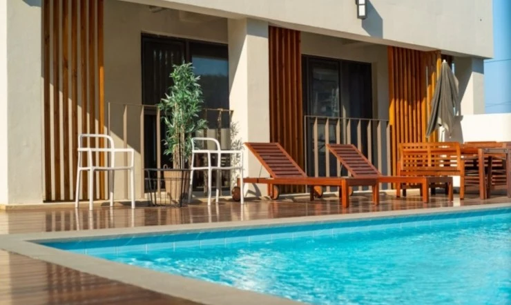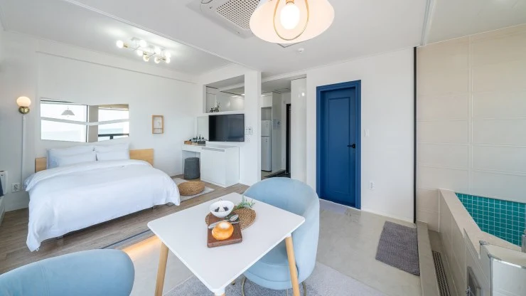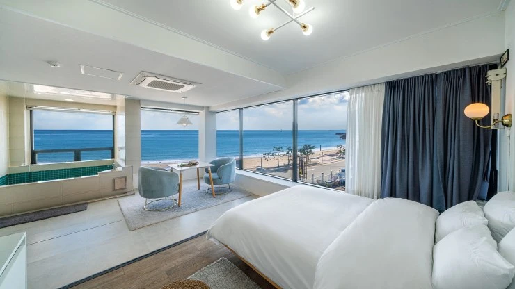 부산 펜션 그레이 샌즈는 송정 바다가 바로 앞에 있어 환상적인 전망을 자랑하는 곳이다. 특히 디럭스 풀빌라 301호 객실은 2인에서 최대 4인까지 머물 수 있는 널찍한 크기와 차분한 색감의 가구들과 창밖 너머 푸른 바다까지 친구와 함께 인생샷 남기기에 딱 좋은 객실이다.