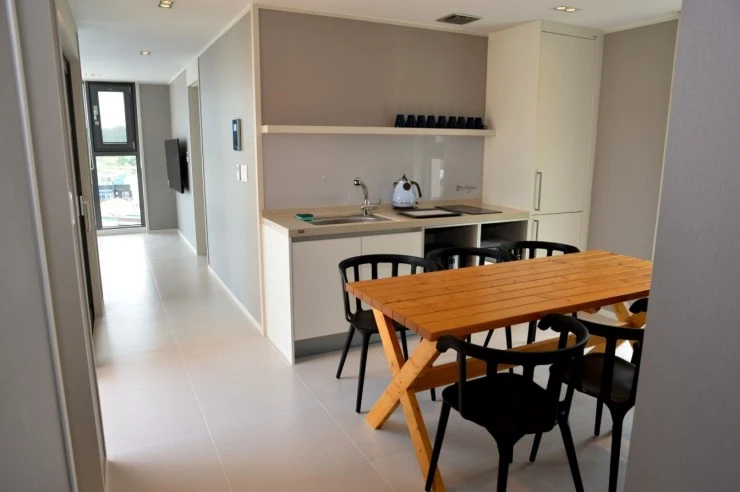 모든 객실에는 주방 공간이 마련되어 있다. 식탁과 냉장고, 핫플레이트, 전기밥솥, 전자레인지 등은 물론 냄비, 프라이팬, 그릇 등 식기류도 모두 준비돼 있다.