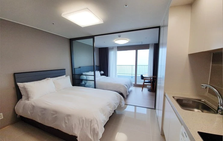 내 집 같은 편안한 공간에 실용성을 더한 객실로 가족 여행객에게 인기가 높다. 더블 침대만 2개를 갖춰, 최대 4명까지 투숙 가능하다. 화장대와 싱크대, 드럼 세탁기, TV 등도 야무지게 준비돼 있다.