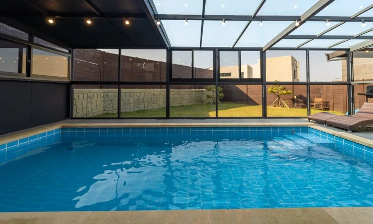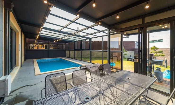 제주 까르마는 매우 넓고 큰 개별 수영장을 보유하고 있어요. 실내라 날씨와 상관없이 사용할 수 있고 유리로 창을 내 답답하지 않아요. 개별 마당과도 연결되어 힐링하기 최고에요! 규모가 워낙 크다보니 미온수 사용료는 80,000원이 추가돼요.