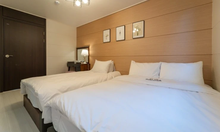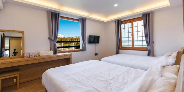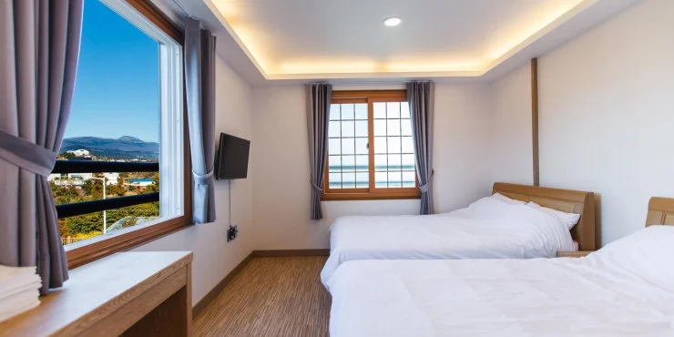 스위트 트윈룸은 가장 전망이 좋은 객실이다. 한라산과 감귤나무, 바다까지 다양한 뷰를 감상할 수 있다. 거실과 침실이 분리되어 있다는 점도 매력적이다. 객실 내에서는 간단한 취사도 가능하다.